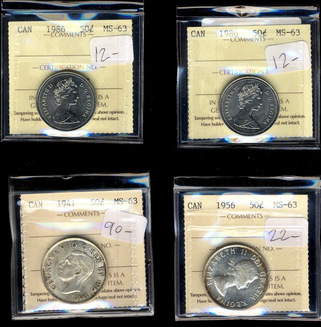 1941 50¢, 1956 & 1986(2) ICCS MS63. Lot of 4 coins.