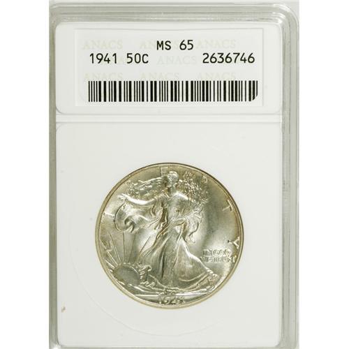 <B>1941 50C MS65 ANACS.</B></I> NGC Census: (2738/2347). PCGS Population (4079/2636). Mintage: 24,207,412. Numismedia Wsl. Price: $160. (#6611)<BR><BR><b>Shipping:</b> Coins & Currency (<a target="_blank" href="http://www.heritageauctions.com/common/shipping.php">view shipping information</a>)