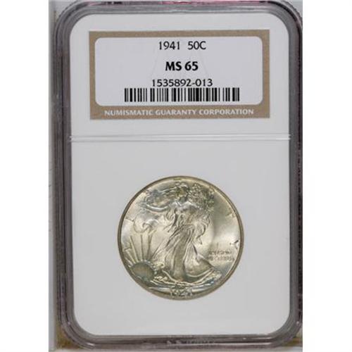 <B>1941 50C MS65 NGC.</B></I> NGC Census: (2741/2358). PCGS Population (4096/2644). Mintage: 24,207,412. Numismedia Wsl. Price for NGC/PCGS coin in MS65: $144. (#6611)<BR><BR><b>Shipping:</b> Coins & Currency (<a target="_blank" href="http://www.heritageauctions.com/common/shipping.php">view shipping information</a>)