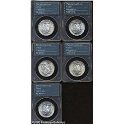 <B>1941 50C MS65 PCGS; 1942 MS65 PCGS; 1943 MS65 PCGS; 1943-D MS65 PCGS;</B></I> and a <B>1946-S MS65 PCGS,</B></I> all are brilliant or nearly so, except for the '43-D, which reveals a thin veneer of light tan color, and all are housed in first generation PCGS holders. 5 Coins Lot:8092