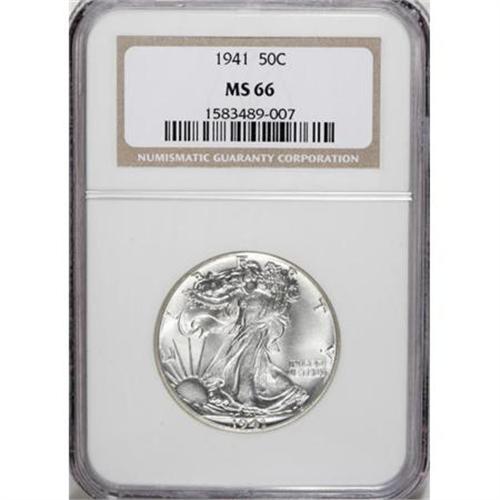 <B>1941 50C MS66 NGC.</B></I> NGC Census: (1930/445). PCGS Population (2237/406). Mintage: 24,207,412. Numismedia Wsl. Price for NGC/PCGS coin in MS66: $192. (#6611)<BR><BR><B>Coin Engraver:</B> Adolph A. Weinman<BR><BR><b>Shipping:</b> Coins & Currency (<a target="_blank" href="http://www.heritageauctions.com/common/shipping.php">view shipping information</a>)