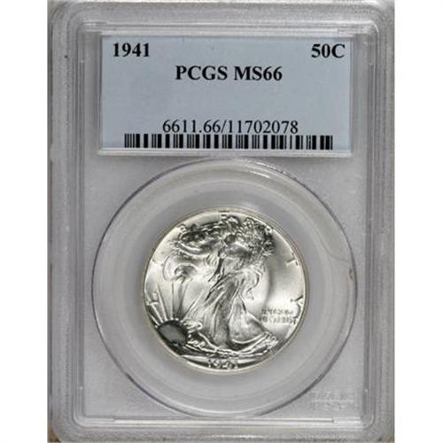 <B>1941 50C MS66 PCGS.</B></I> PCGS Population (2237/406). NGC Census: (1930/445). Mintage: 24,207,412. Numismedia Wsl. Price for NGC/PCGS coin in MS66: $192. (#6611)<BR><BR><B>Coin Engraver:</B> Adolph A. Weinman<BR><BR><b>Shipping:</b> Coins & Currency (<a target="_blank" href="http://www.heritageauctions.com/common/shipping.php">view shipping information</a>)