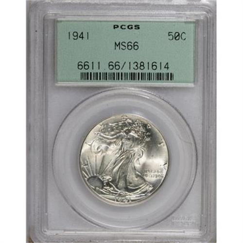 <B>1941 50C MS66 PCGS.</B></I> PCGS Population (2241/406). NGC Census: (1937/446). Mintage: 24,207,412. Numismedia Wsl. Price for NGC/PCGS coin in MS66: $200. (#6611)<BR><BR><B>Coin Engraver:</B> Adolph A. Weinman<BR><BR><b>Shipping:</b> Coins & Currency (<a target="_blank" href="http://www.heritageauctions.com/common/shipping.php">view shipping information</a>)