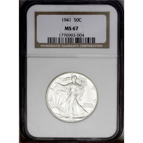 <B>1941<50C> MS67 NGC.</B></I> Fully white with blazing luster over the unabraded surfaces. This boldly struck, appealing Superb Gem would fit nicely into a type or date collection. <BR><BR><B>Important notice:</B> Heritage usually auctions material at the rate of 200-250 lots per hour. On some occasions eBay Live bid software or the Internet may not be able to keep up with the pace of the auction. We recommend placing a realistic absentee bid now as insurance to avoid disappointment. Occasionally the auctioneer may eliminate or reject an eBay Live bid, and the auctioneer may also reopen a lot after the close of the eBay live bidding (usually because we missed an audience bid), and may reject your bid even if it shows you as the winning bidder. By bidding via eBay Live, you agree that Heritage may award the lot to another bidder at its sole discretion under the circumstances described above or any other reasonable circumstances. Since eBay bids are not shown to us until we open the lot on the floor, we treat those bids just like floor bids. In most cases the floor responds before the eBay bid is presented to us, due to Internet lag time, so for consistency we have made it a policy that floor bids are always considered first over tie eBay live bids. Also please note that all Heritage lots purchased through eBay Live carry a 20% Buyer's Premium. Please make sure you read the Terms and Conditions before you bid. This lot is being auctioned in conjunction with a live floor auction by Heritage Galleries & Auctioneers. All final auction and invoice information will be supplied by Heritage Galleries & Auctioneers, and all other information should be considered preliminary. Lot:2988 <BR><BR><B>Winning Notification and Billing:</B> After the FINAL session in this auction is complete, Heritage will send e-mail and snail mail invoices. This process normally takes several days. All final auction and invoice information will be supplied by Heritage Galleries & Auctioneers, and all other information should be considered preliminary. <BR><BR>This auction will be conducted on a live auction floor and over the Internet through eBay Live. If you choose to place an absentee bid, please take a moment to <font color='#0000ff'><u><a href='http://pages.ebay.com/liveauctions/help/before/laabsentee.html'>learn how eBay Live absentee bidding works</a></u></font><font color='#000000'>