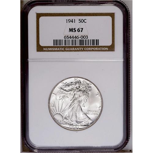 <B>1941<50C> MS67 NGC.</B></I> Brilliant on both sides, with a pleasing strike and surfaces of nearly unsurpassable quality. Immaculately preserved, despite the passage of 60+ years. NGC has graded 11 examples finer (3/06). <BR><BR><B>Important notice:</B> Heritage usually auctions material at the rate of 200-250 lots per hour. On some occasions eBay Live bid software or the Internet may not be able to keep up with the pace of the auction. We recommend placing a realistic absentee bid now as insurance to avoid disappointment. Occasionally the auctioneer may eliminate or reject an eBay Live bid, and the auctioneer may also reopen a lot after the close of the eBay live bidding (usually because we missed an audience bid), and may reject your bid even if it shows you as the winning bidder. By bidding via eBay Live, you agree that Heritage may award the lot to another bidder at its sole discretion under the circumstances described above or any other reasonable circumstances. Since eBay bids are not shown to us until we open the lot on the floor, we treat those bids just like floor bids. In most cases the floor responds before the eBay bid is presented to us, due to Internet lag time, so for consistency we have made it a policy that floor bids are always considered first over tie eBay live bids. Also please note that all Heritage lots purchased through eBay Live carry a 20% Buyer's Premium. Please make sure you read the Terms and Conditions before you bid. This lot is being auctioned in conjunction with a live floor auction by Heritage Galleries & Auctioneers. All final auction and invoice information will be supplied by Heritage Galleries & Auctioneers, and all other information should be considered preliminary. Lot:2987 <BR><BR><B>Winning Notification and Billing:</B> After the FINAL session in this auction is complete, Heritage will send e-mail and snail mail invoices. This process normally takes several days. All final auction and invoice information will be supplied by Heritage Galleries & Auctioneers, and all other information should be considered preliminary. <BR><BR>This auction will be conducted on a live auction floor and over the Internet through eBay Live. If you choose to place an absentee bid, please take a moment to <font color='#0000ff'><u><a href='http://pages.ebay.com/liveauctions/help/before/laabsentee.html'>learn how eBay Live absentee bidding works</a></u></font><font color='#000000'>