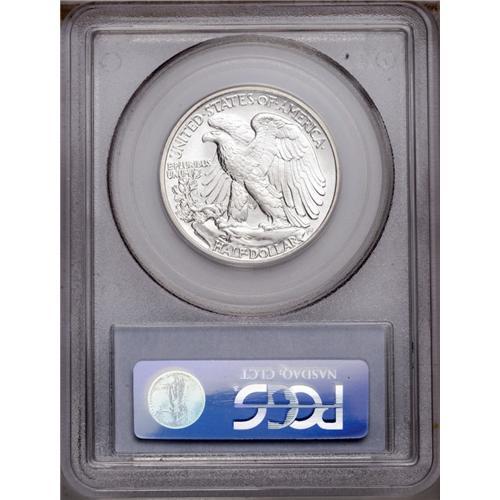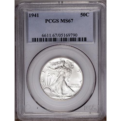 <B>1941<50C> MS67 PCGS.</B></I> Brilliant surfaces exude dazzling luster and sharply defined motifs; the left thumb and adjacent branches reveal excellent delineation. A shiny, flat area on Liberty's left (right facing) breast is mentioned for accuracy. PCGS has seen 11 coins grading finer (2/06).