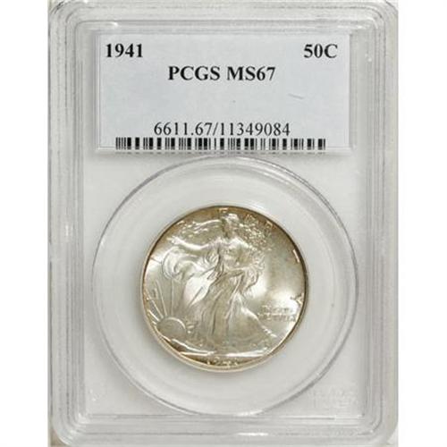 <B>1941 50C MS67 PCGS.</B></I> PCGS Population (397/12). NGC Census: (429/16). Mintage: 24,207,412. Numismedia Wsl. Price for NGC/PCGS coin in MS67: $610. (#6611)<BR><BR><B>Coin Engraver:</B> Adolph A. Weinman<BR><BR><b>Shipping:</b> Coins & Currency (<a target="_blank" href="http://www.heritageauctions.com/common/shipping.php">view shipping information</a>\)