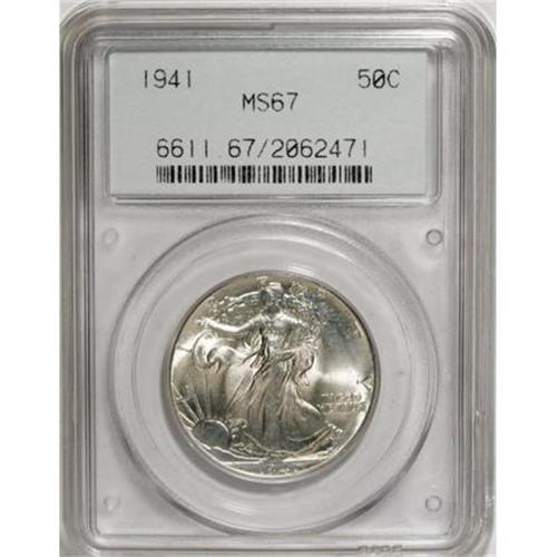 <B>1941 50C MS67 PCGS.</B></I> PCGS Population (394/12). NGC Census: (431/16). Mintage: 24,207,412. Numismedia Wsl. Price for NGC/PCGS coin in MS67: $635. (#6611)<BR><BR><B>Coin Engraver:</B> Adolph A. Weinman<BR><BR><b>Shipping:</b> Coins & Currency (<a target="_blank" href="http://www.heritageauctions.com/common/shipping.php">view shipping information</a>)