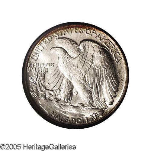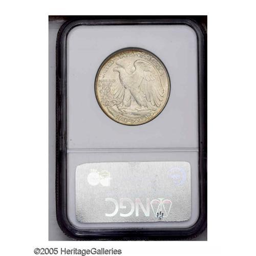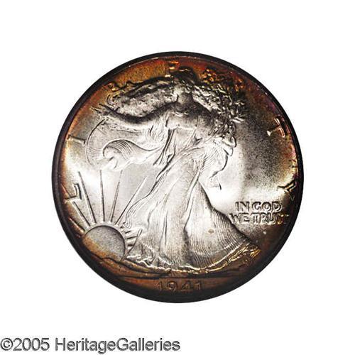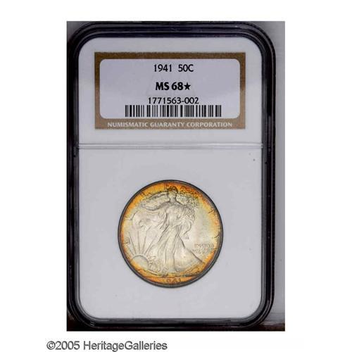 <B>1941<50C> MS68 <S NGC.</B></I> A simply lovely coin irrespective of date, the surfaces are fully lustrous with a bright, frosty sheen. Richly toned at the obverse border, and virtually blemish-free, both sides are fully brought up in all areas. A coin that belongs in either the finest date collection or a type set of stellar Superb Gems. NGC and PCGS combined have seen just 24 coins in MS68, and, not surprisingly, there are none finer (11/05).