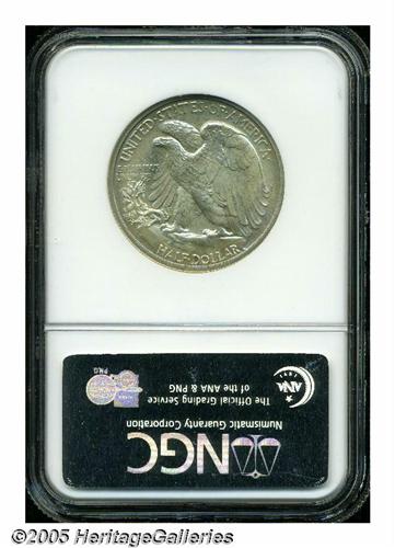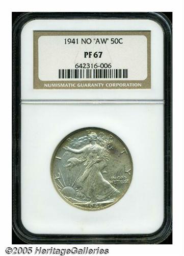 <B>1941<50C> "No AW" PR67 NGC.</B></I> Not a trace of the designer's initials can be found on the reverse of this heavily polished proof Walker. Speckled ice-blue and light beige patina render an overall milky appearance on each side. The design elements are exquisitely struck, and the surfaces are devoid of significant marks.