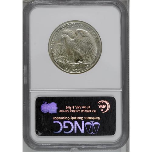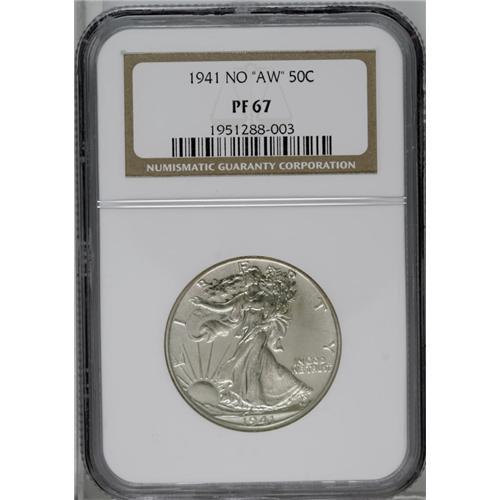 <B>1941<50C> PR67 NGC.</B></I> No AW. One of the finer examples of this popular variant with excellent surfaces throughout. There is the usual blush of hazy gray toning on both sides, typical of most proofs seen from this period. The AW initials were apparently polished off the die by the mint during the proof die preparation process. These are scarcer than the regular issue. NGC has graded 55 pieces this high with another 14 coins finer of this variety. <BR><BR><B>Important notice:</B> Heritage usually auctions material at the rate of 200-250 lots per hour. On some occasions eBay Live bid software or the Internet may not be able to keep up with the pace of the auction. We recommend placing a realistic absentee bid now as insurance to avoid disappointment. Occasionally the auctioneer may eliminate or reject an eBay Live bid, and the auctioneer may also reopen a lot after the close of the eBay live bidding (usually because we missed an audience bid), and may reject your bid even if it shows you as the winning bidder. By bidding via eBay Live, you agree that Heritage may award the lot to another bidder at its sole discretion under the circumstances described above or any other reasonable circumstances. Since eBay bids are not shown to us until we open the lot on the floor, we treat those bids just like floor bids. In most cases the floor responds before the eBay bid is presented to us, due to Internet lag time, so for consistency we have made it a policy that floor bids are always considered first over tie eBay live bids. Also please note that all Heritage lots purchased through eBay Live carry a 20% Buyer's Premium. Please make sure you read the Terms and Conditions before you bid. This lot is being auctioned in conjunction with a live floor auction by Heritage Galleries & Auctioneers. All final auction and invoice information will be supplied by Heritage Galleries & Auctioneers, and all other information should be considered preliminary. Lot:3056 <BR><BR><B>Winning Notification and Billing:</B> After the FINAL session in this auction is complete, Heritage will send e-mail and snail mail invoices. This process normally takes several days. All final auction and invoice information will be supplied by Heritage Galleries & Auctioneers, and all other information should be considered preliminary. <BR><BR>This auction will be conducted on a live auction floor and over the Internet through eBay Live. If you choose to place an absentee bid, please take a moment to <font color='#0000ff'><u><a href='http://pages.ebay.com/liveauctions/help/before/laabsentee.html'>learn how eBay Live absentee bidding works</a></u></font><font color='#000000'>