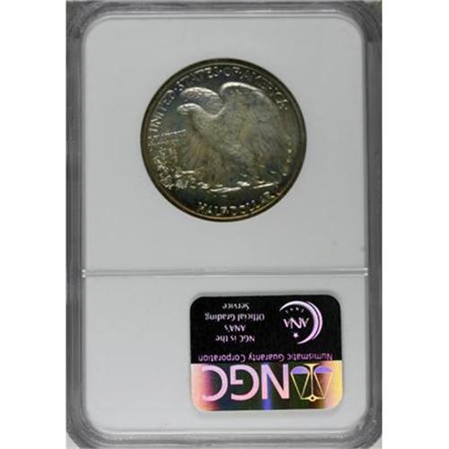 <B>1941 50C No "AW" PR67 <img border='0' src='http://www.heritagecoins.com/images/star.gif' width=10 height=10> NGC.</B></I> Gorgeous gold, lime-green, and rose hues enliven this well struck and lovingly preserved Premium Gem. The designer's monogram is absent, as made from a lapped die.<BR><BR><B>Coin Engraver:</B> Adolph A. Weinman<BR><BR><b>Shipping:</b> Coins & Currency (<a target="_blank" href="http://www.heritageauctions.com/common/shipping.php">view shipping information</a>)
