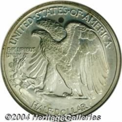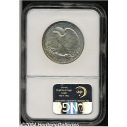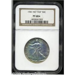 <B>1941<50C> No AW PR68 <S NGC.</B></I> A thin overlay of gold, powder-blue, and mint-green patina embraces this exquisitely struck Superb Gem. The designer's monogram is absent, as made due to a lapped die. Essentially unimprovable quality. Population: 39 in 68, 1 finer (6/04). <BR><BR><B>Important notice:</B> Heritage usually auctions material at the rate of 200-250 lots per hour. On some occasions eBay Live bid software or the Internet may not be able to keep up with the pace of the auction. We recommend placing a realistic absentee bid now as insurance to avoid disappointment. Occasionally the auctioneer may eliminate or reject an eBay Live bid, and the auctioneer may also reopen a lot after the close of the eBay live bidding (usually because we missed an audience bid), and may reject your bid even if it shows you as the winning bidder. By bidding via eBay Live, you agree that Heritage may award the lot to another bidder at its sole discretion under the circumstances described above or any other reasonable circumstances. Since eBay bids are not shown to us until we open the lot on the floor, we treat those bids just like floor bids. In most cases the floor responds before the eBay bid is presented to us, due to Internet lag time, so for consistency we have made it a policy that floor bids are always considered first over tie eBay live bids. Also please note that all Heritage lots purchased through eBay Live carry a 20% Buyer's Premium. Please make sure you read the Terms and Conditions before you bid. </span></font></tr></table></td></tr></table>