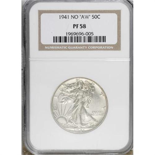 <B>1941 50C No "AW" PR58 NGC.</B></I> NGC Census: (2/2704). PCGS Population (0/3882). Mintage: 15,412. (#6641)<BR><BR><B>Coin Engraver:</B> Adolph A. Weinman<BR><BR><b>Shipping:</b> Coins & Currency (<a target="_blank" href="http://www.heritageauctions.com/common/shipping.php">view shipping information</a>)