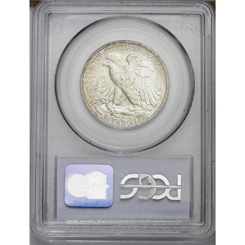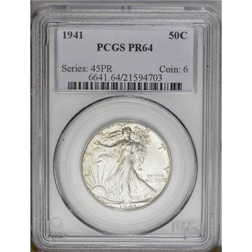 <B>1941<50C> PR64 PCGS.</B></I> No AW. Cream-gray and walnut-brown streaks alternate across this meticulously struck and faintly hairlined near-Gem. The majority of proof 1941 Walkers lack the designer's monogram, which was inadvertently removed during die preparation.