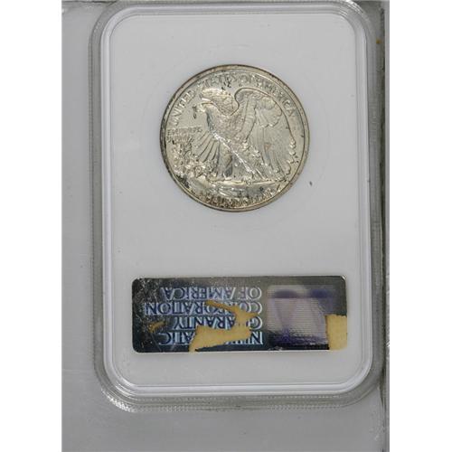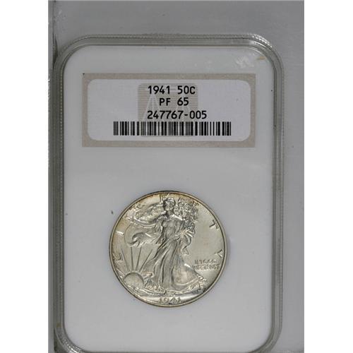 <B>1941<50C> PR65 NGC.</B></I> A Gem with moderate mirrors in the untoned areas. This coin has somewhat hazy surfaces with thick green-brown toning and small dark spots scattered on the reverse.