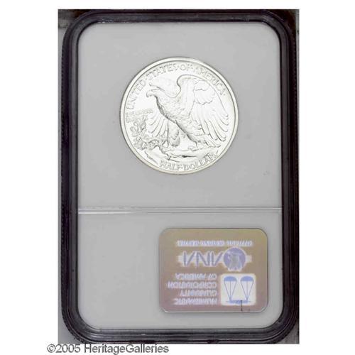 <B>1941<50C> PR65 NGC.</B></I> Breen-5182. Without the AW monogram on the reverse. According to Walter Breen, proofs coined from January to October are from dies that were excessively polished, unintentionally removing the monogram. They probably constitute 3/4 of the proof mintage. This is a brilliant, fully struck specimen with immensely reflective fields that are virtually untouched by cloudy patina.