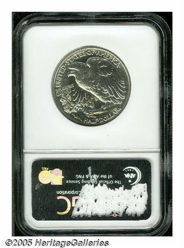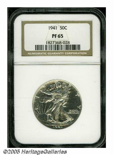 <B>1941<50C> PR65 NGC.</B></I> The devices, especially the Walking Liberty, exhibit mild cameo contrast with the mirrored fields. The designer's monogram is present on this brilliant and beautifully preserved Gem. Struck from moderately rotated dies.