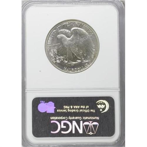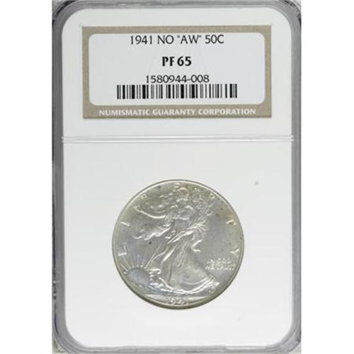 <B>1941 50C No "AW" PR65 NGC.</B></I> NGC Census: (751/1299). PCGS Population (1324/1156). Mintage: 15,412. Numismedia Wsl. Price for NGC/PCGS coin in PR65: $640. (#6641)<BR><BR><B>Coin Engraver:</B> Adolph A. Weinman<BR><BR><b>Shipping:</b> Coins & Currency (<a target="_blank" href="http://www.heritageauctions.com/common/shipping.php">view shipping information</a>\)