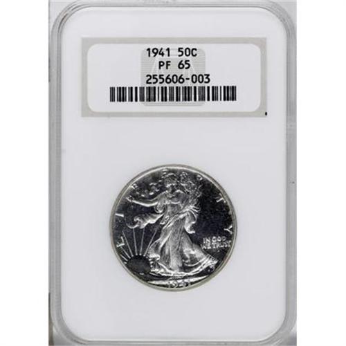 <B>1941 50C PR65 NGC.</B></I> Strongly mirrored with slight whispers of golden toning at the margins and dots of sage in the fields. A pleasing Gem from this later proof Walker issue of 15,412 specimens.<BR><BR><B>Coin Engraver:</B> Adolph A. Weinman<BR><BR><b>Shipping:</b> Coins & Currency (<a target="_blank" href="http://www.heritageauctions.com/common/shipping.php">view shipping information</a>)