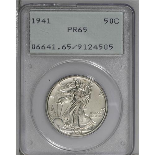 <B>1941<50C> PR65 PCGS.</B></I> A virtually untoned Gem with deeply mirrored and well-preserved fields. This specimen was struck from heavily polished dies that lack certain details, especially on Liberty's mantle.