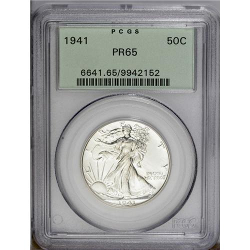 <B>1941<50C> PR65 PCGS.</B></I> Essentially brilliant with highly reflective fields. This piece shows only a faint outline of the AW monogram. <BR><BR><B>Important notice:</B> Heritage usually auctions material at the rate of 200-250 lots per hour. On some occasions eBay Live bid software or the Internet may not be able to keep up with the pace of the auction. We recommend placing a realistic absentee bid now as insurance to avoid disappointment. Occasionally the auctioneer may eliminate or reject an eBay Live bid, and the auctioneer may also reopen a lot after the close of the eBay live bidding (usually because we missed an audience bid), and may reject your bid even if it shows you as the winning bidder. By bidding via eBay Live, you agree that Heritage may award the lot to another bidder at its sole discretion under the circumstances described above or any other reasonable circumstances. Since eBay bids are not shown to us until we open the lot on the floor, we treat those bids just like floor bids. In most cases the floor responds before the eBay bid is presented to us, due to Internet lag time, so for consistency we have made it a policy that floor bids are always considered first over tie eBay live bids. Also please note that all Heritage lots purchased through eBay Live carry a 20% Buyer's Premium. Please make sure you read the Terms and Conditions before you bid. This lot is being auctioned in conjunction with a live floor auction by Heritage Galleries & Auctioneers. All final auction and invoice information will be supplied by Heritage Galleries & Auctioneers, and all other information should be considered preliminary. Lot:3052 <BR><BR><B>Winning Notification and Billing:</B> After the FINAL session in this auction is complete, Heritage will send e-mail and snail mail invoices. This process normally takes several days. All final auction and invoice information will be supplied by Heritage Galleries & Auctioneers, and all other information should be considered preliminary. <BR><BR>This auction will be conducted on a live auction floor and over the Internet through eBay Live. If you choose to place an absentee bid, please take a moment to <font color='#0000ff'><u><a href='http://pages.ebay.com/liveauctions/help/before/laabsentee.html'>learn how eBay Live absentee bidding works</a></u></font><font color='#000000'>