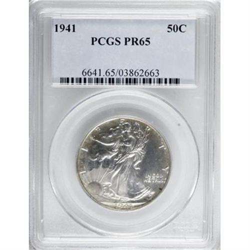 <B>1941 50C PR65 PCGS.</B></I> PCGS Population (1324/1156). NGC Census: (751/1299). Mintage: 15,412. Numismedia Wsl. Price for NGC/PCGS coin in PR65: $640. (#6641)<BR><BR><B>Coin Engraver:</B> Adolph A. Weinman<BR><BR><b>Shipping:</b> Coins & Currency (<a target="_blank" href="http://www.heritageauctions.com/common/shipping.php">view shipping information</a>\)