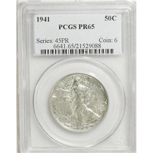 <B>1941 50C PR65 PCGS.</B></I> PCGS Population (1327/1177). NGC Census: (769/1346). Mintage: 15,412. Numismedia Wsl. Price for NGC/PCGS coin in PR65: $600. (#6641)<BR><BR><B>Coin Engraver:</B> Adolph A. Weinman<BR><BR><b>Shipping:</b> Coins & Currency (<a target="_blank" href="http://www.heritageauctions.com/common/shipping.php">view shipping information</a>)