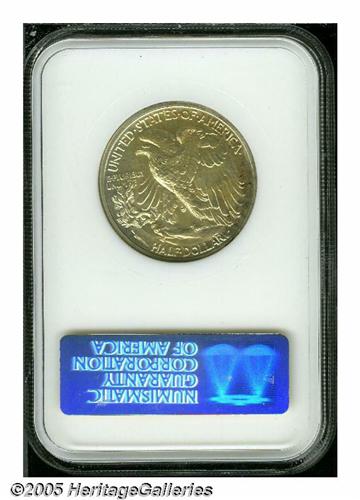 <B>1941<50C> PR66 NGC.</B></I> An intricately struck and essentially pristine premium Gem that has flashy fields and original sky-gray and tan patina. The designer's initials are not present on this piece, the outcome of a lapped reverse die.