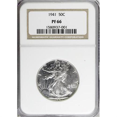 <B>1941 50C PR66 NGC.</B></I> No AW. This needle-sharp Premium Gem is devoid of hairlines, and the mirrored fields are flashy. Brilliant aside from traces of milk-gray on the upper right obverse field, and a few tiny areas of dark toning on the obverse rim at 12, 1, and 3 o'clock.<BR><BR><B>Coin Engraver:</B> Adolph A. Weinman<BR><BR><b>Shipping:</b> Coins & Currency (<a target="_blank" href="http://www.heritageauctions.com/common/shipping.php">view shipping information</a>)