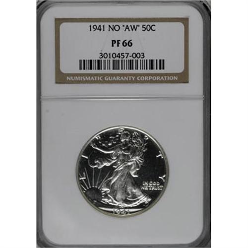 <B>1941 50C PR66 NGC.</B></I> No AW. A brilliant Premium Gem that boasts an intricate strike. The devices have hints of cameo frost. The designer's monogram was lapped away during die preparation, as often seen on the 1941 proofs.<BR><BR><B>Coin Engraver:</B> Adolph A. Weinman<BR><BR><b>Shipping:</b> Coins & Currency (<a target="_blank" href="http://www.heritageauctions.com/common/shipping.php">view shipping information</a>)