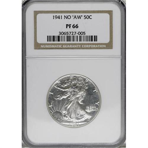 <B>1941 50C "No Aw" PR66 NGC.</B></I> NGC Census: (891/450). PCGS Population (894/282). Mintage: 15,412. Numismedia Wsl. Price for NGC/PCGS coin in PR66: $685. (#6641)<BR><BR><B>Coin Engraver:</B> Adolph A. Weinman<BR><BR><b>Shipping:</b> Coins & Currency (<a target="_blank" href="http://www.heritageauctions.com/common/shipping.php">view shipping information</a>)