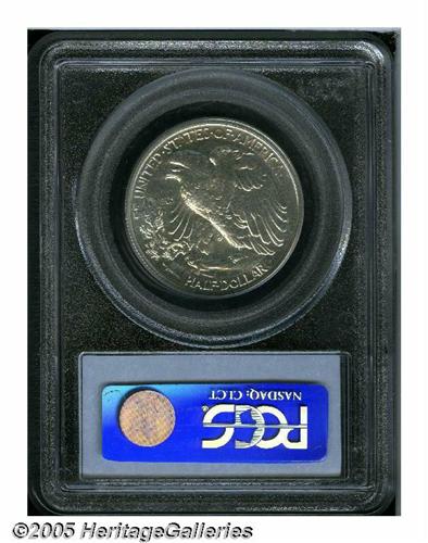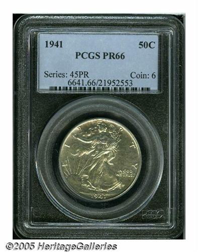 <B>1941<50C> PR66 PCGS.</B></I> Sharply struck with highly reflective fields and a light layer of dappled, milky toning over both sides. The initials of the designer, Adolph Weinman, are missing from their usual location on the lower right reverse, a not unusual feature for 1941 proof Walking Liberty halves from the Philadelphia Mint.