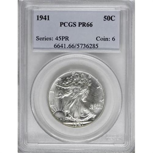 <B>1941 50C PR66 PCGS.</B></I> The AW monogram is present but faint. This Premium Gem is virtually brilliant, but has hints of gold toning. The fields are satiny but show modest reflectivity.<BR><BR><B>Coin Engraver:</B> Adolph A. Weinman<BR><BR><b>Shipping:</b> Coins & Currency (<a target="_blank" href="http://www.heritageauctions.com/common/shipping.php">view shipping information</a>)