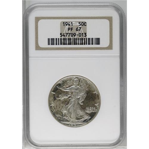 <B>1941<50C> PR67 NGC.</B></I> A "No AW" variety without any indication of the engraver's initials. This lightly toned and intricately struck Superb Gem is both problem-free and impressive. <BR><BR><B>Important notice:</B> Heritage usually auctions material at the rate of 200-250 lots per hour. On some occasions eBay Live bid software or the Internet may not be able to keep up with the pace of the auction. We recommend placing a realistic absentee bid now as insurance to avoid disappointment. Occasionally the auctioneer may eliminate or reject an eBay Live bid, and the auctioneer may also reopen a lot after the close of the eBay live bidding (usually because we missed an audience bid), and may reject your bid even if it shows you as the winning bidder. By bidding via eBay Live, you agree that Heritage may award the lot to another bidder at its sole discretion under the circumstances described above or any other reasonable circumstances. Since eBay bids are not shown to us until we open the lot on the floor, we treat those bids just like floor bids. In most cases the floor responds before the eBay bid is presented to us, due to Internet lag time, so for consistency we have made it a policy that floor bids are always considered first over tie eBay live bids. Also please note that all Heritage lots purchased through eBay Live carry a 20% Buyer's Premium. Please make sure you read the Terms and Conditions before you bid. This lot is being auctioned in conjunction with a live floor auction by Heritage Galleries & Auctioneers. All final auction and invoice information will be supplied by Heritage Galleries & Auctioneers, and all other information should be considered preliminary. Lot:3055 <BR><BR><B>Winning Notification and Billing:</B> After the FINAL session in this auction is complete, Heritage will send e-mail and snail mail invoices. This process normally takes several days. All final auction and invoice information will be supplied by Heritage Galleries & Auctioneers, and all other information should be considered preliminary. <BR><BR>This auction will be conducted on a live auction floor and over the Internet through eBay Live. If you choose to place an absentee bid, please take a moment to <font color='#0000ff'><u><a href='http://pages.ebay.com/liveauctions/help/before/laabsentee.html'>learn how eBay Live absentee bidding works</a></u></font><font color='#000000'>