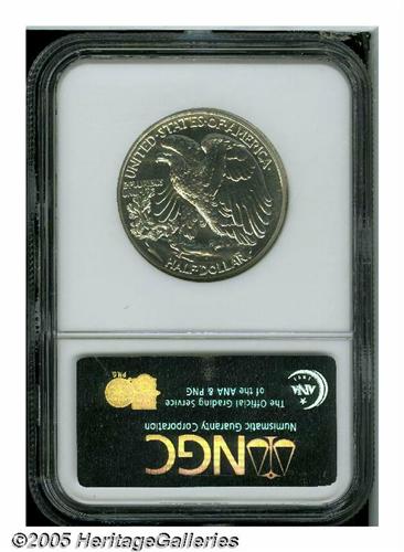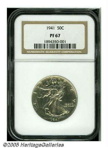 <B>1941<50C> PR67 NGC.</B></I> A needle-sharp and undisturbed Superb Gem. The upper right obverse field has a hint of tan color, but the specimen is otherwise brilliant. The designer's monogram is present although faint.