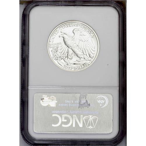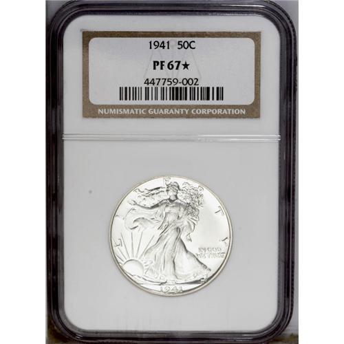 <B>1941<50C> PR67 <img border='0' src='http://www.heritagecoins.com/images/star.gif' width=10 height=10> NGC.</B></I> Luminous proof surfaces display boldly executed design features, including full definition on the left thumb and adjacent branches and in the gown lines. The designer's AW monogram is bold, unusual for half dollars of this date. Untoned and immaculately preserved. There is no denying the coveted Star designation on this marvelous Walker. Census: 8 in 67 <img border='0' src='http://www.heritagecoins.com/images/star.gif' width=10 height=10>, 2 finer <img border='0' src='http://www.heritagecoins.com/images/star.gif' width=10 height=10> (3/06).<BR><I>From The David L. Goodwin Collection.</B></I> <BR><BR><B>Important notice:</B> Heritage usually auctions material at the rate of 200-250 lots per hour. On some occasions eBay Live bid software or the Internet may not be able to keep up with the pace of the auction. We recommend placing a realistic absentee bid now as insurance to avoid disappointment. Occasionally the auctioneer may eliminate or reject an eBay Live bid, and the auctioneer may also reopen a lot after the close of the eBay live bidding (usually because we missed an audience bid), and may reject your bid even if it shows you as the winning bidder. By bidding via eBay Live, you agree that Heritage may award the lot to another bidder at its sole discretion under the circumstances described above or any other reasonable circumstances. Since eBay bids are not shown to us until we open the lot on the floor, we treat those bids just like floor bids. In most cases the floor responds before the eBay bid is presented to us, due to Internet lag time, so for consistency we have made it a policy that floor bids are always considered first over tie eBay live bids. Also please note that all Heritage lots purchased through eBay Live carry a 20% Buyer's Premium. Please make sure you read the Terms and Conditions before you bid. This lot is being auctioned in conjunction with a live floor auction by Heritage Galleries & Auctioneers. All final auction and invoice information will be supplied by Heritage Galleries & Auctioneers, and all other information should be considered preliminary. Lot:3057 <BR><BR><B>Winning Notification and Billing:</B> After the FINAL session in this auction is complete, Heritage will send e-mail and snail mail invoices. This process normally takes several days. All final auction and invoice information will be supplied by Heritage Galleries & Auctioneers, and all other information should be considered preliminary. <BR><BR>This auction will be conducted on a live auction floor and over the Internet through eBay Live. If you choose to place an absentee bid, please take a moment to <font color='#0000ff'><u><a href='http://pages.ebay.com/liveauctions/help/before/laabsentee.html'>learn how eBay Live absentee bidding works</a></u></font><font color='#000000'>
