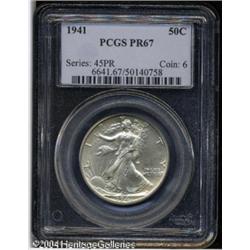 1941 50C PR67 PCGS. The bright proof surfaces show <B>1941 50C PR67 PCGS.</B></I> The bright proof surfaces show a milky color. Exquisitely struck, with no mentionable marks. <BR><BR><B>Important notice:</B> Heritage usually auctions material at the rate of 200-250 lots per hour. On some occasions eBay Live bid software or the Internet may not be able to keep up with the pace of the auction. We recommend placing a realistic absentee bid now as insurance to avoid disappointment. Occasionally the auctioneer may eliminate or reject an eBay Live bid, and the auctioneer may also reopen a lot after the close of the eBay live bidding (usually because we missed an audience bid), and may reject your bid even if it shows you as the winning bidder. By bidding via eBay Live, you agree that Heritage may award the lot to another bidder at its sole discretion under the circumstances described above or any other reasonable circumstances. Since eBay bids are not shown to us until we open the lot on the floor, we treat those bids just like floor bids. In most cases the floor responds before the eBay bid is presented to us, due to Internet lag time, so for consistency we have made it a policy that floor bids are always considered first over tie eBay live bids. Also please note that all Heritage lots purchased through eBay Live carry a 20% Buyer's Premium. Please make sure you read the Terms and Conditions before you bid. This lot is being auctioned in conjunction with a live floor auction by Heritage Galleries & Auctioneers. All final auction and invoice information will be supplied by Heritage Galleries & Auctioneers, and all other information should be considered preliminary. Lot:6303