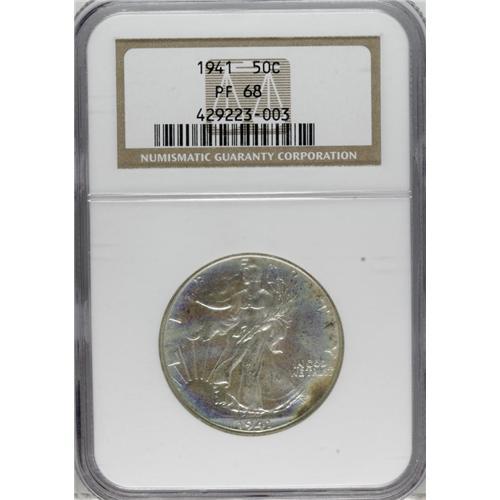 <B>1941 50C PR68 NGC.</B></I> A near-perfect proof representative of this beautifully designed and ever-popular type. A touch of hazy, pale iridescence is seen over both sides of this amazing proof whose surfaces are virtually as struck. Unexcelled at both of the major services. Census: 59 in 68, 0 finer (4/07).<BR><BR><b>Shipping:</b> Coins & Currency (<a target="_blank" href="http://www.heritageauctions.com/common/shipping.php">view shipping information</a>)