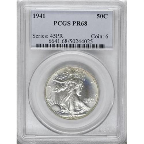 <B>1941 50C PR68 PCGS. CAC.</B></I> The AW monogram is present on this beautifully toned specimen. The centers are brilliant, but the borders are sea-green, gold, and rose-red. An exactingly struck and pristine proof representative of this widely collected silver type. Population: 13 in 68, 0 finer (11/07).<BR><I>From The Kallenberg #1 PCGS Registry Set Of Proof Half Dollars.</B></I><BR><BR><B>Coin Engraver:</B> Adolph A. Weinman<BR><BR><b>Shipping:</b> Coins & Currency (<a target="_blank" href="http://www.heritageauctions.com/common/shipping.php">view shipping information</a>)