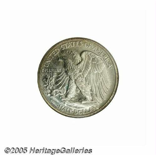 <B>1941<50C> PR69 NGC.</B></I> In 1941, the Philadelphia Mint coined 15,412 Proof Walking Liberty half dollars, some with Adolph Weinman's monogram on the reverse and others, like this one, without his monogram. In his <I>Complete Encyclopedia,</B></I> Walter Breen explained that the latest Proof examples, struck in November and December have bold initials, while the earlier ones from January through October were produced from lapped dies without the designer's initials. Alternatively, the Proof dies may have been made without Weinman's initials. Careful examination fails to show any other evidence of lapping on the reverse die. Perhaps the coinage hubs lacked the initials when they produced the individual coinage dies. Examples struck in 1942, as well as some earlier Proofs, have also been identified without the AW monogram.<BR> This Superb, Ultra-Premium Gem Proof has light cameo contrast with intense toning over deeply mirrored fields. The obverse has the faintest blue-green toning at the center, surrounded by violet, russet, and amber color at the borders. On the reverse, the surfaces have pale champagne color with hints of teal and iridescent toning. This is a boldly struck Proof as it should be. For the collector who desires a true fully struck Walking Liberty Half Dollar, this is a perfect choice. It nicely illustrates the design as Weinman intended. Over the years, we have only handled about 20 examples that graded PR68, and of course, none at the present grade level. The presence of even the slightest contrast between the fields and devices creates an additional importance to this amazing coin. Population: 1 in 69, 0 finer (6/05).<BR><I>From The Robert Moreno Collection.</B></I>