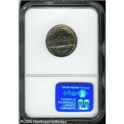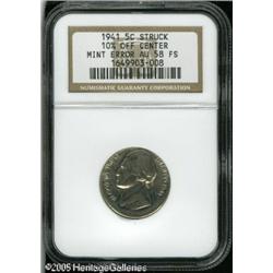 <B>1941 5C Jefferson Nickel--10% Off Center--AU58 Full Steps NGC.</B></I> Although a few degrees off center, this piece has the appearance of an uncentered broadstrike, since design details are generally intact and a wide area of unstruck surface is found at 6 o'clock. The steps of Monticello are fully struck. The legends near the border exhibit heavy distortion, from unrestrained metal flow to the rims. Lightly toned and lustrous. Lot:10956