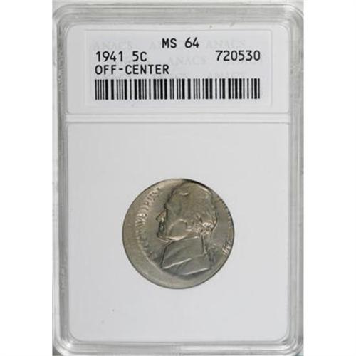 <B>1941 5C Jefferson Nickel--Off-Center--MS64 ANACS.</B></I> <BR><BR><B>Coin Engraver:</B> Felix Schlag<BR><BR><b>Shipping:</b> Coins & Currency (<a target="_blank" href="http://www.heritageauctions.com/common/shipping.php">view shipping information</a>)