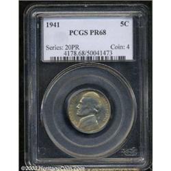 <TABLE cellSpacing=0 cellPadding=0 width="100%" bgColor=#000000 border=0><TBODY><TR><TD width="100%"><TABLE cellSpacing=1 cellPadding=3 width="100%" border=0><TBODY><TR><TD width="100%" bgColor=#79735c><FONT face=arial color=#ffffff size=3><B>Description</B> </FONT></TD></TR><TR><TD width="100%" bgColor=#ffffff><FONT face=arial size=2><B>1941 5C PR68 PCGS.</B></I> This is the finest proof 1941 Jefferson Nickel that has yet been certified by either service. The deeply reflective fields remain intact despite a rich peripheral ring of smoky-gold, green, and red patina on each side. Fully detailed and essentially perfect. Population: 1 in 68, 0 finer (8/03). </FONT></TD></TR></TBODY></TABLE></TD></TR></TBODY></TABLE><BR><A name=PricesRealized></A><TABLE cellSpacing=0 cellPadding=0 width="100%" bgColor=#000000 border=0><TBODY><TR><TD width="100%"><TABLE cellSpacing=1 cellPadding=3 width="100%" border=0><TBODY><TR><TD width="100%" bgColor=#79735c><A name=PR><FONT face=arial color=#ffffff size=3><B>Previous Prices from Heritage Auctions</B> </FONT></A></TD></TR><TR><TD bgColor=#f6f6ed>No Prior Data Recorded </TD></TR><TR><TD bgColor=#ffffff><FONT face=arial size=1 ?>PLEASE NOTE: All prices realized reflect the final hammer price PLUS the buyer's premium in auctions that charge a buyer's premium. Each item has a notation at the top of the listing indicating whether that lot included a buyer's premium. Example: A item that sells with a final hammer price of $100 and a 20% buyer's premium will display with a price realized of $120. All information listed is intended to be as accurate as possible, but errors are possible. Please use this guide carefully and inform us of any inaccuracies. </FONT></TD></TR></TBODY></TABLE></TD></TR></TBODY></TABLE><BR><TABLE cellSpacing=0 cellPadding=0 width="100%" bgColor=#000000 border=0><TBODY><TR><TD width="100%"><TABLE cellSpacing=1 cellPadding=3 width="100%" border=0><TBODY><TR><TD width="100%" bgColor=#79735c colSpan=6><FONT face=arial color=#ffffff size=3><B>Price Guide*</B> </FONT></TD></TR><TR bgColor=#f6f6ed><TD align=middle><B>Grade</B> </TD><TD align=middle><B>Coin World<BR>(Trends)</B> </TD><TD align=middle><B>Numismedia<BR>Retail</B> </TD><TD align=middle><B>Numismedia<BR>Wholesale</B> </TD><TD align=middle><B>Coin<BR>Universe</B> </TD><TD align=middle><B>Heritage<BR>Value Index</B> </TD></TR><TR bgColor=#ffffff><TD align=middle>67</TD><TD align=right>---</TD><TD align=right>$390.00</TD><TD align=right>$300.00</TD><TD align=right>$500.00</TD><TD align=right>$325.00</TD></TR><TR style="FONT-WEIGHT: bold" bgColor=#cccfdd><TD align=middle>68</TD><TD align=right>---</TD><TD align=right>---</TD><TD align=right>---</TD><TD align=right>---</TD><TD align=right>---</TD></TR><TR bgColor=#ffffff><TD align=middle>69</TD><TD align=right>---</TD><TD align=right>---</TD><TD align=right>---</TD><TD align=right>---</TD><TD align=right>---</TD></TR><TR bgColor=#ffffff><TD colSpan=6><FONT size=1>*All information listed is intended to be as accurate as possible, but errors are possible. No item may be returned or refused based on this information which is provided as a service to our customers. You should contact each pricing source directly to determine the accuracy of this information. </FONT></TD></TR></TBODY></TABLE></TD></TR></TBODY></TABLE><BR><TABLE cellSpacing=0 cellPadding=0 width="100%" bgColor=#000000 border=0><TBODY><TR><TD width="100%"><TABLE cellSpacing=1 cellPadding=3 width="100%" border=0><TBODY><TR><TD width="100%" bgColor=#79735c><FONT face=arial color=#ffffff size=3><B>Population Guide</B> </FONT></TD></TR><TR bgColor=#ffffff><TD align=middle><!-- Begin Output of Population Grid--><TABLE cellSpacing=0 cellPadding=0 width="100%" border=0><TBODY><TR><TD vAlign=center><TABLE cellSpacing=0 width="100%" border=1 cellsadding="3"><TBODY><TR><TD vAlign=center><TABLE cellSpacing=0 cellPadding=3 width="100%" border=1><TBODY><TR><TD vAlign=center align=middle bgColor=#f0f1e8 colSpan=2 <CENTER><FONT face=Arial size=2><B>PCGS Pop </B></FONT><CENTER></CENTER></TD><TD vAlign=center align=middle bgColor=#f0f1e8 colSpan=2><CENTER><FONT face=Arial size=2><B>NGC Pop</B></CENTER></FONT></TD></TR><TR><TD vAlign=center><FONT face=Arial size=2>(68)</FONT> </TD><TD vAlign=center align=right><FONT face=Arial size=2>1</FONT> </TD><TD vAlign=center><FONT face=Arial size=2>(68)</FONT> </TD><TD vAlign=center align=right><FONT face=Arial size=2>0</FONT> </TD></TR><TR><TD vAlign=center><FONT face=Arial size=2>(>68)</FONT> </TD><TD vAlign=center align=right><FONT face=Arial size=2>0</FONT> </TD><TD vAlign=center><FONT face=Arial size=2>(>68)</FONT> </TD><TD vAlign=center align=right><FONT face=Arial size=2>0</FONT> </TD></TR></TBODY></TABLE></TD></TR></TBODY></TABLE></TD></TR></TBODY></TABLE><!-- End Output of Population Grid--> Important notice: Heritage usually auctions material at the rate of 200-250 lots per hour. On some occasions eBay Live bid software or the Internet may not be able to keep up with the pace of the auction. We recommend placing a realistic absentee bid now as insurance to avoid disappointment. Occasionally the auctioneer may eliminate or reject an eBay Live bid, and the auctioneer may also reopen a lot after the close of the eBay live bidding (usually because we missed an audience bid), and may reject your bid even if it shows you as the winning bidder. By bidding via eBay Live, you agree that Heritage may award the lot to another bidder at its sole discretion under the circumstances described above or any other reasonable circumstances. Also please note that all Heritage lots purchased through eBay Live carry a 20% Buyer's Premium. Please make sure you read the Terms and Conditions before you bid.</TD></TR></TBODY></TABLE></TD></TR></TBODY></TABLE>