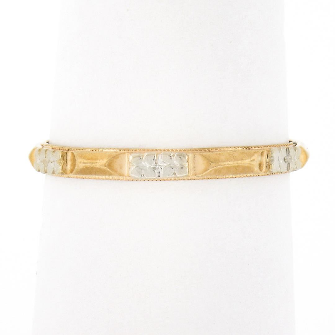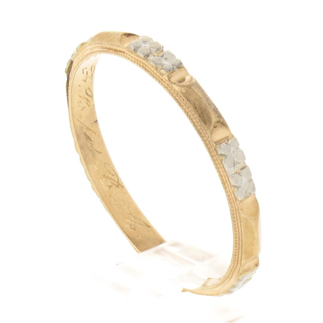 An antique solid 14k yellow & white gold band ring. The ring is size 7.0, weighs a total of 1.40 grams, and measures 2.1mm wide.