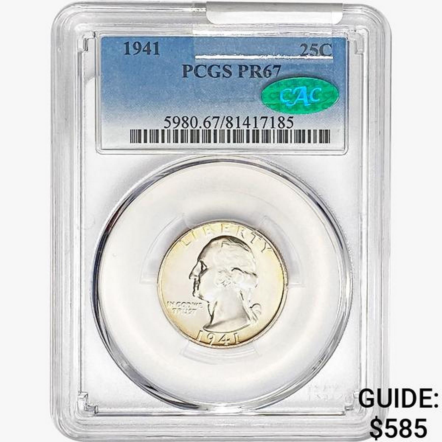 1941 CAC Washington Silver Quarter PCGS PR67
