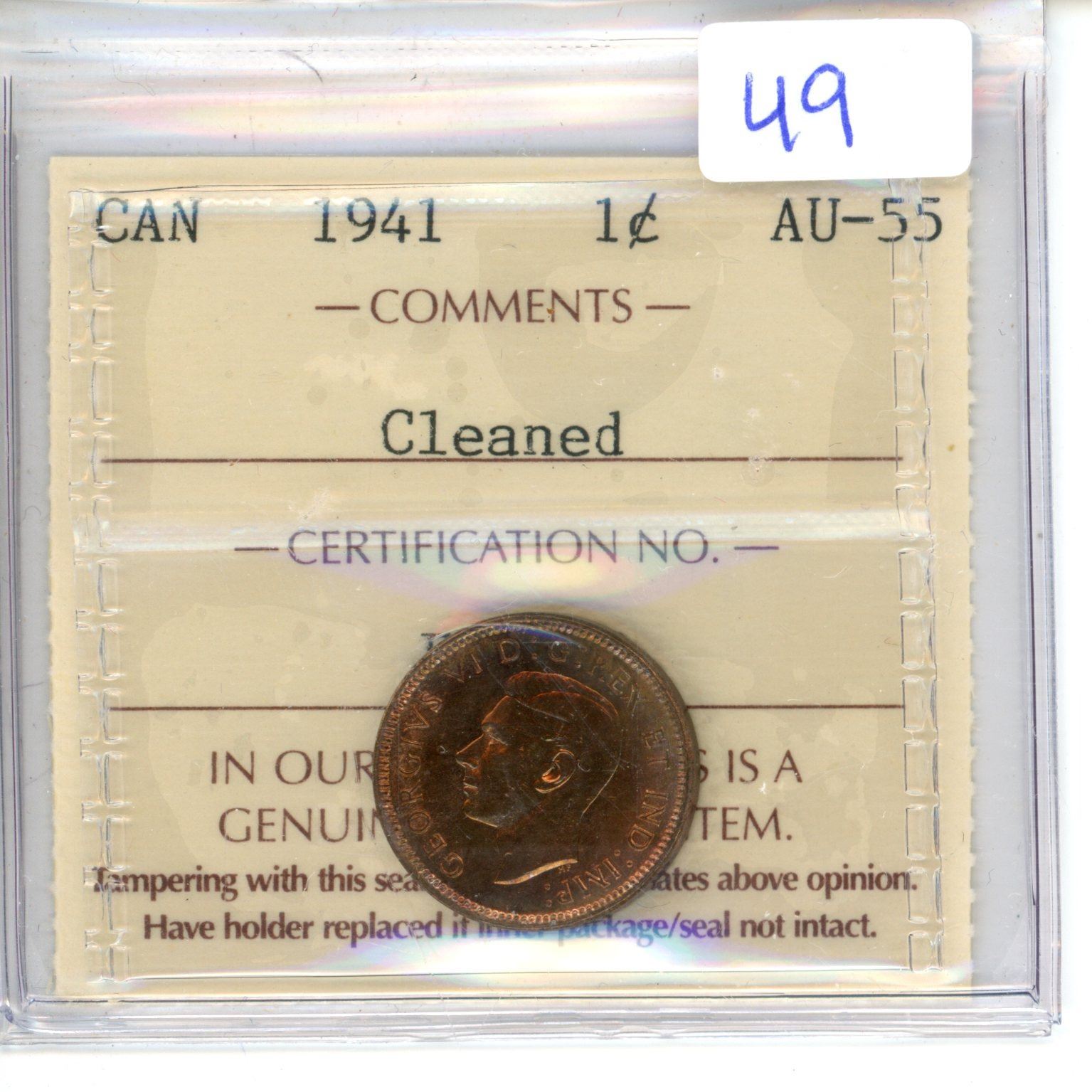 1941 Canada 1¢; AU 55 (ICCS # EC 982)