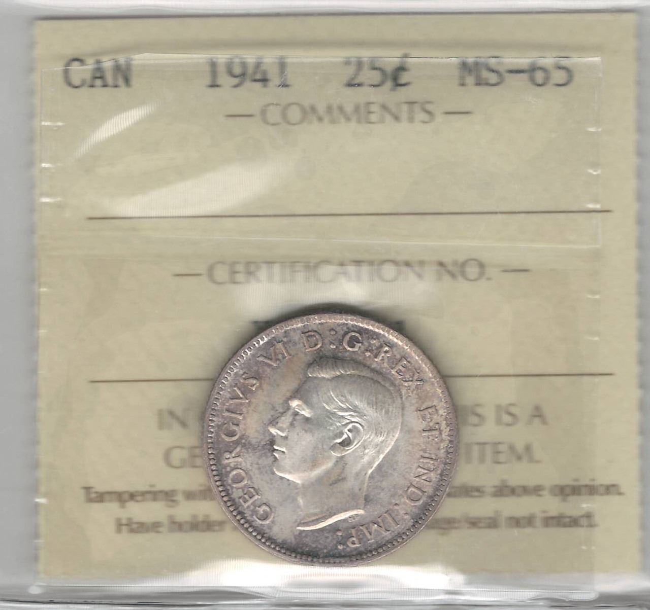 1941 Canada 25 Cent ICCS MS 65