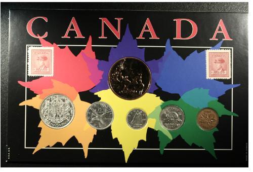 Attractive year set in specially designed colorful cardboard display holder. Set includes penny, nickel, silver 10, 25 & 50 cent along with commemorative copper medallion.