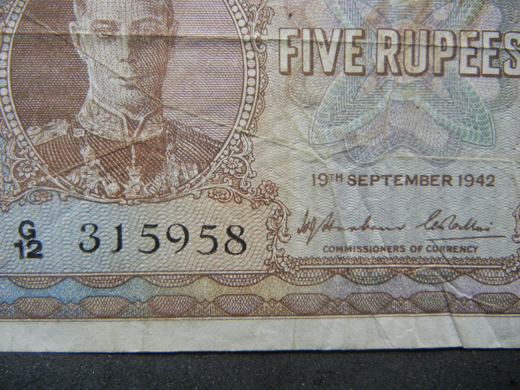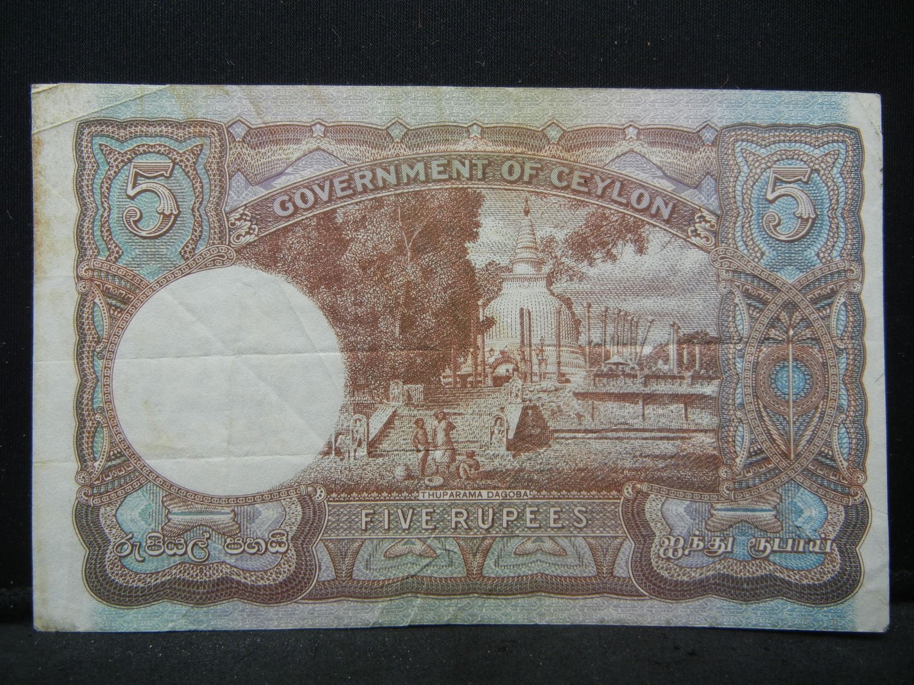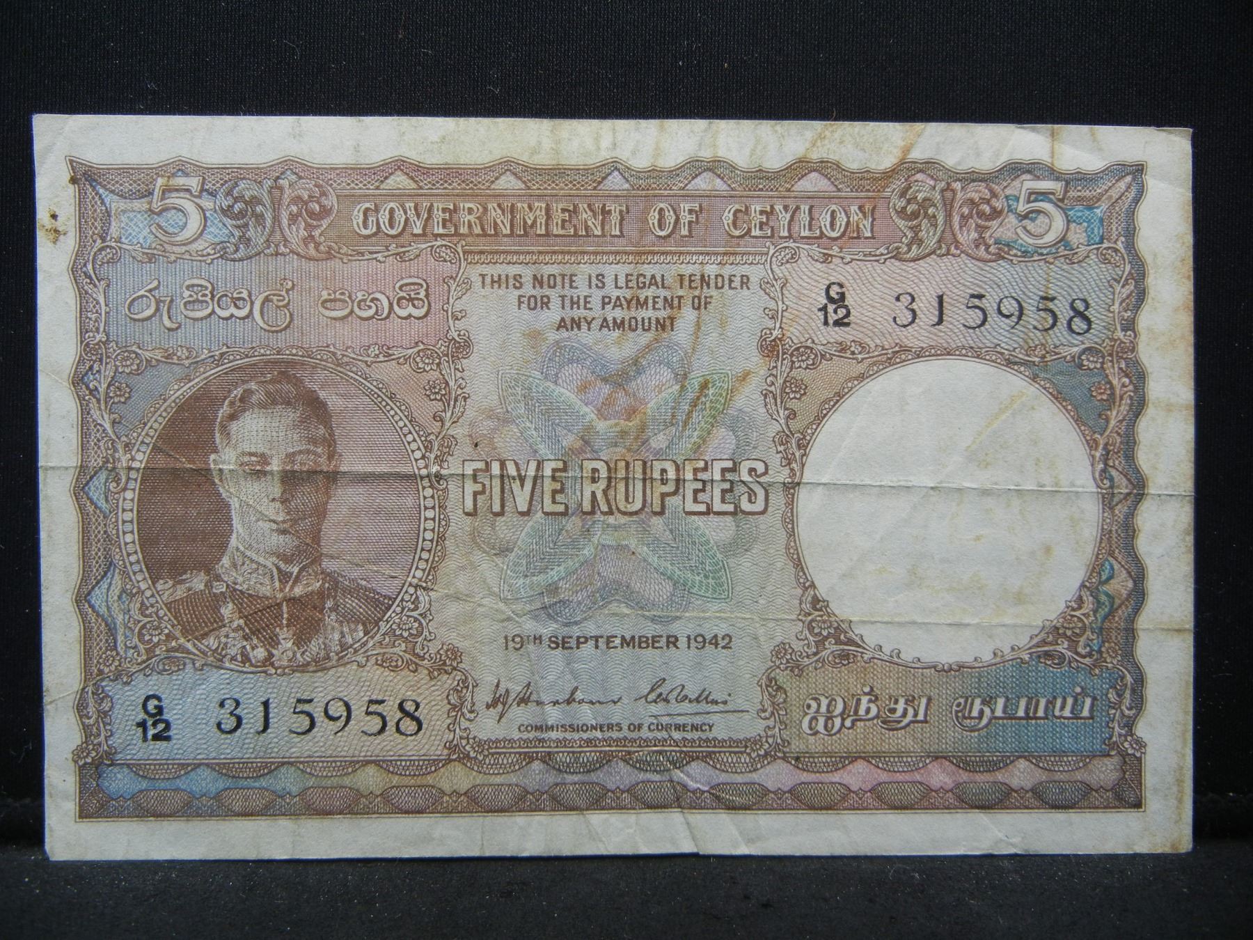 1941 Ceylon 5 Rupees. These old British related notes are scarce. Very Fine.